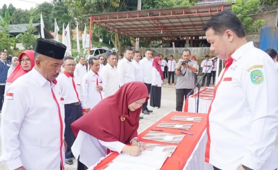 Selanjutnya, digelar acara penandatanganan berita acara pelantikan yang dilakukan Ketua PMI Kecamatan, Camat, dan Ketua PMI Kabupaten.